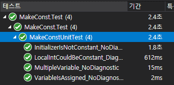 따라서 위에서 설명한 InitializerIsNotConstant_NoDiagnostic 테스트의 int i = DateTime.Now.DayOfYear; 에서 const를 추가하도록 리포팅하지 않아야함에도 불구하고 리포팅을 하기 때문에 테스트를 실패하게 됩니다.