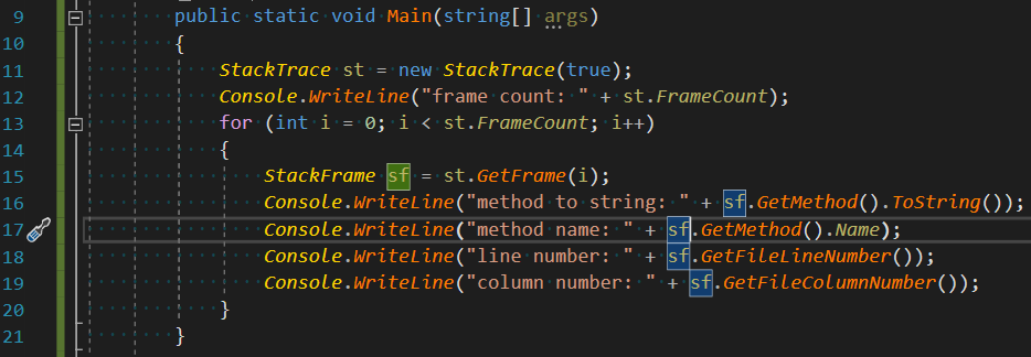 호출 순서의 역순으로 표시되기 때문에 그 다음 줄은 MyClass의 LogStackTrace() 함수이고 그 다음 줄은 Main() 함수가 되게 됩니다.