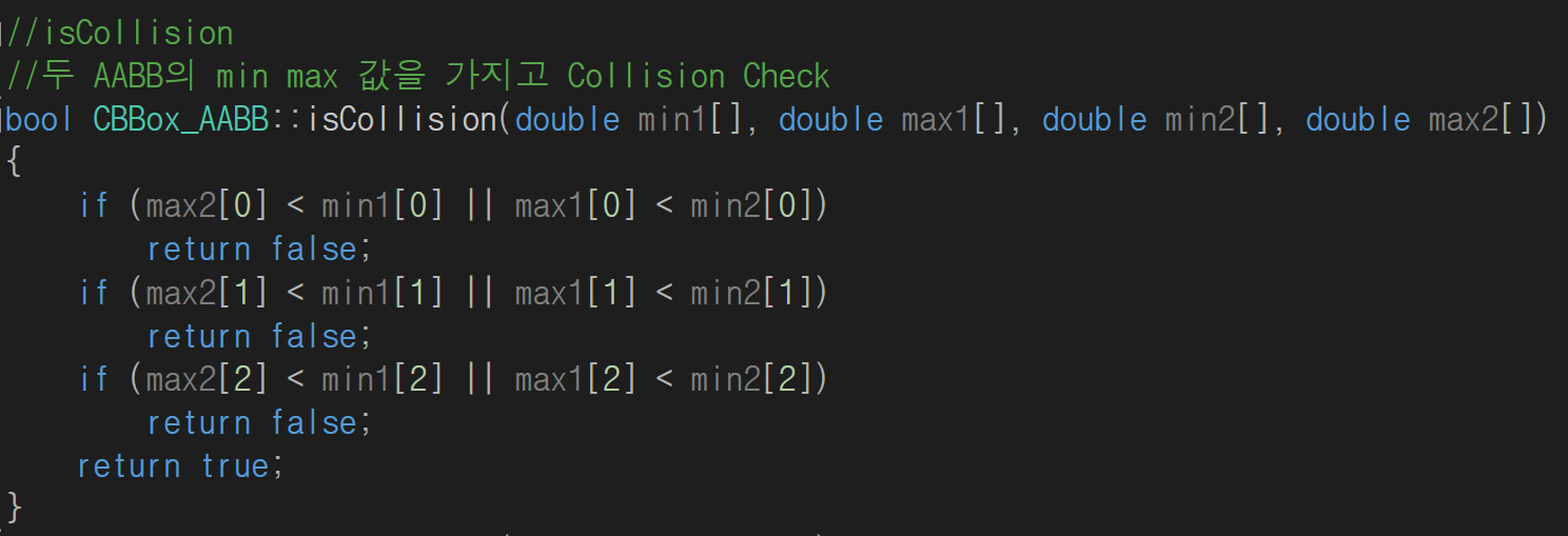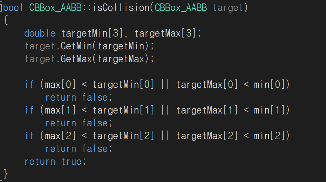 아래 이미지는 위에서 만든 AABB Class를 활용하여 Collision Check를 하는 Code 입니다.