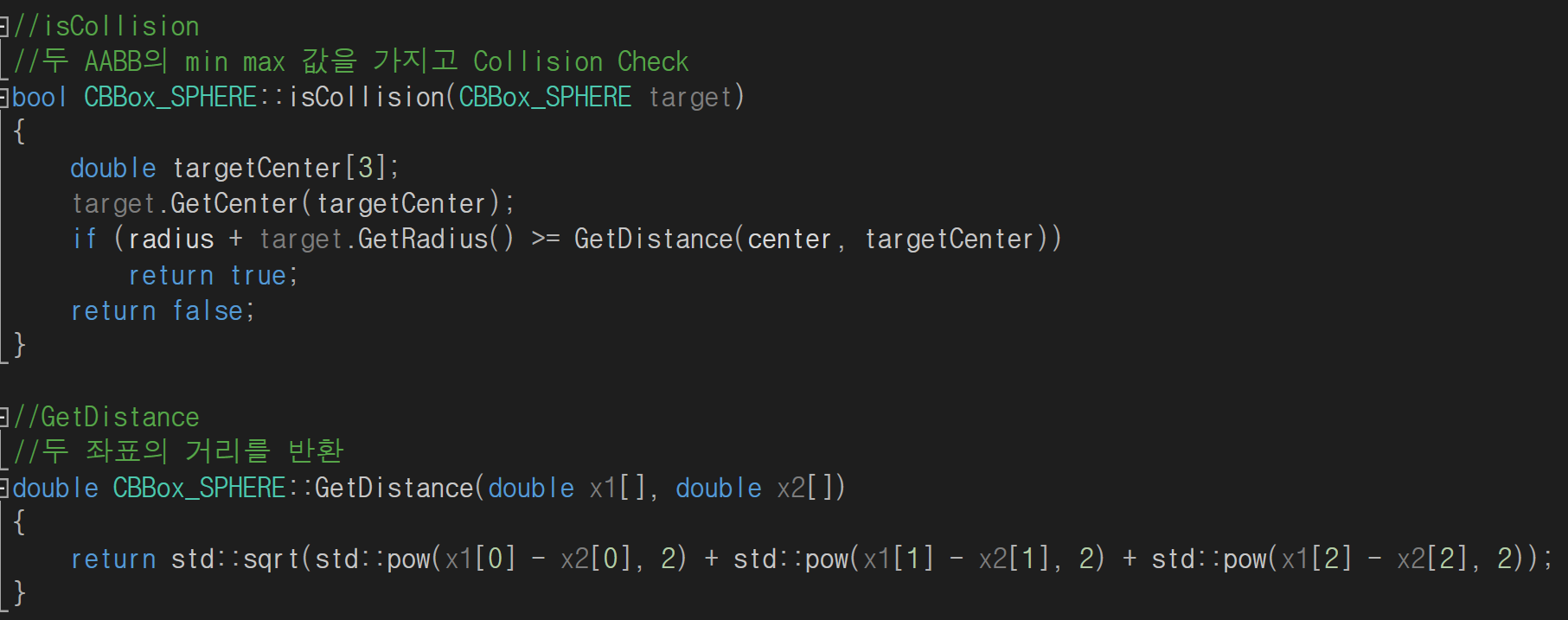 코드로 표현하면 아래와 같이 됩니다. SPhere도 AABB와 동일하게 Class를 생성하여 Collision Check 함수를 만들어 주었습니다.