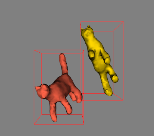 지금까지 설명한 내용들을 토대로 Collision이 되면 Bounding Box가 빨간색이 되도록 Code를 짜보았습니다. 아래 이미지는 두 Cat Model에 대해서 AABB를 생성하고 Collision이 되어 빨간색으로 표현된 상태입니다.