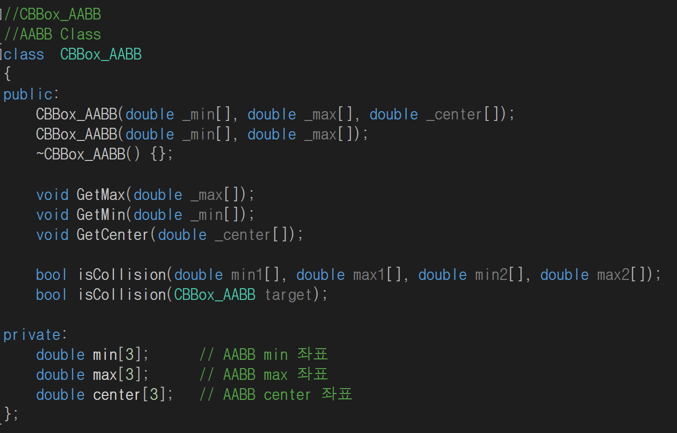 저는 관리를 용이하게 하기 위해 AABB class를 만들어 Collision Check를 할 수 있게 했습니다.