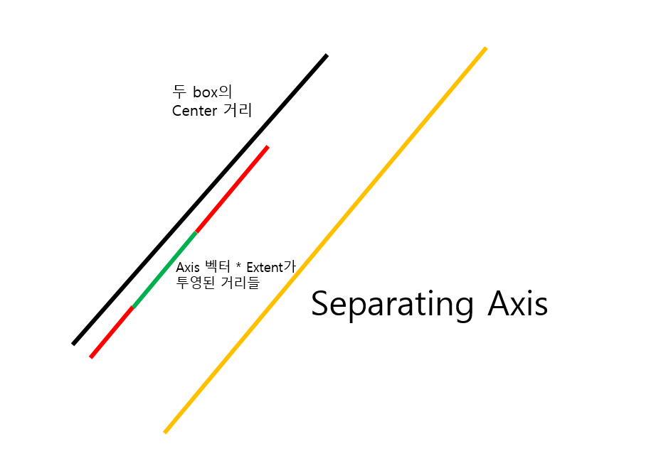 아래 그림과 같이 두 박스의 중심을 이은 벡터(검정색 화살표)를 Separating Axis(노란선)에 투영한 결과(검정색 선) 입니다. 이 길이가 기준이 됩니다.