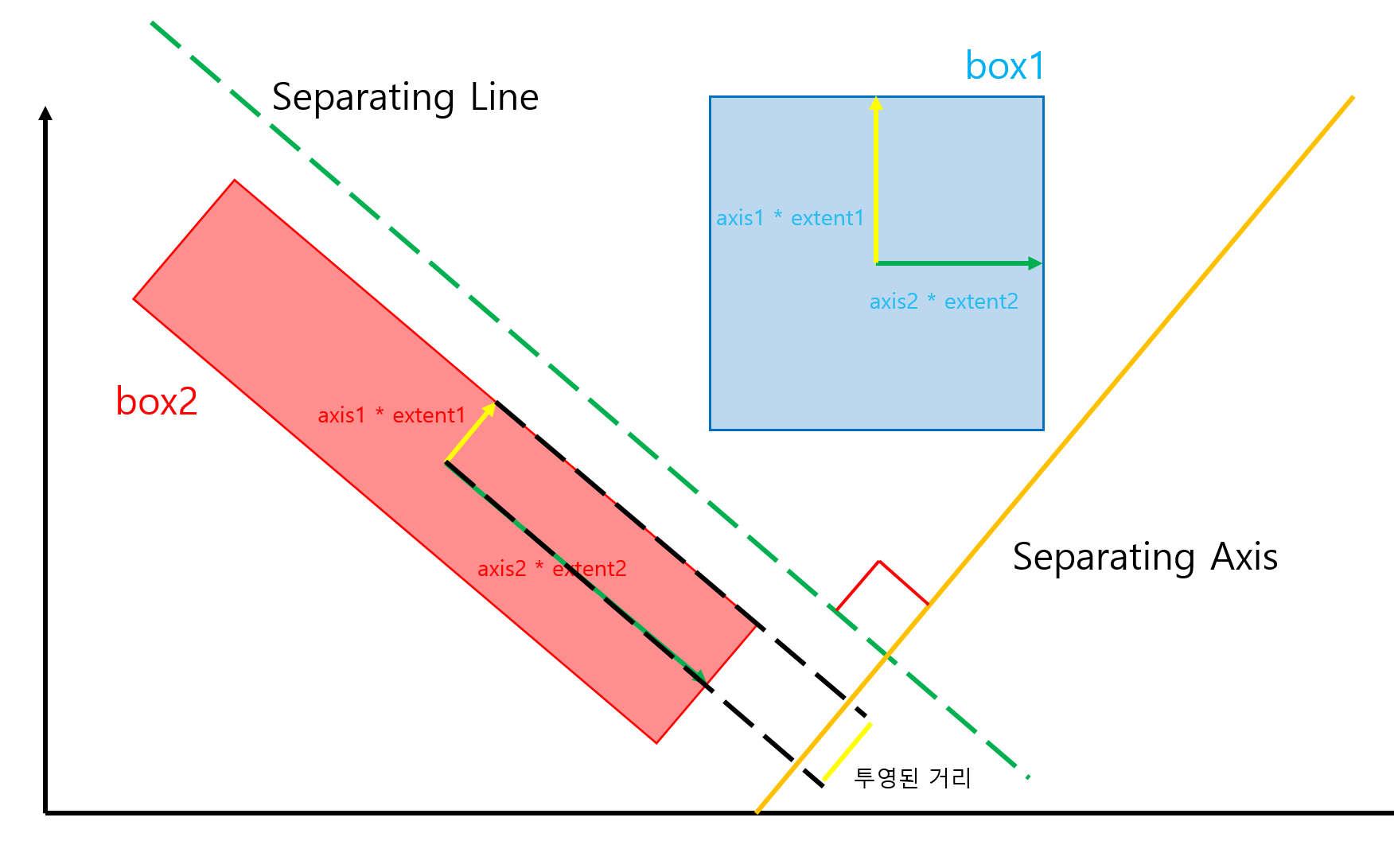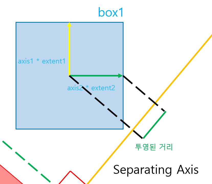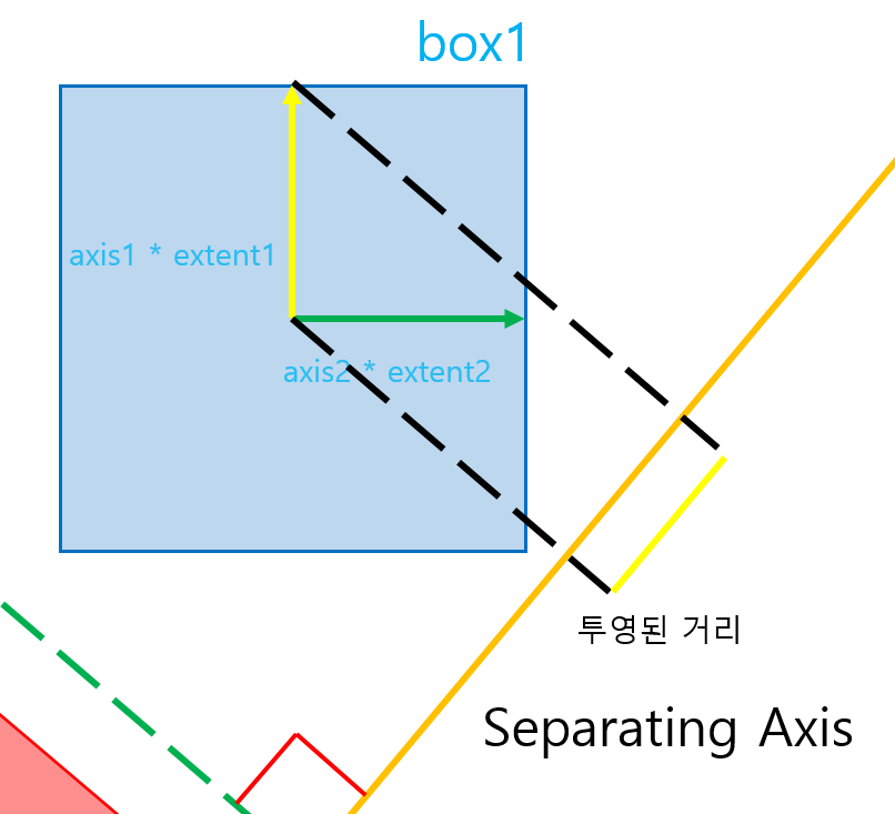 아래 그림은 box1의 두 Axis 벡터 * Extent를 투영한 결과를 나타낸 것입니다.