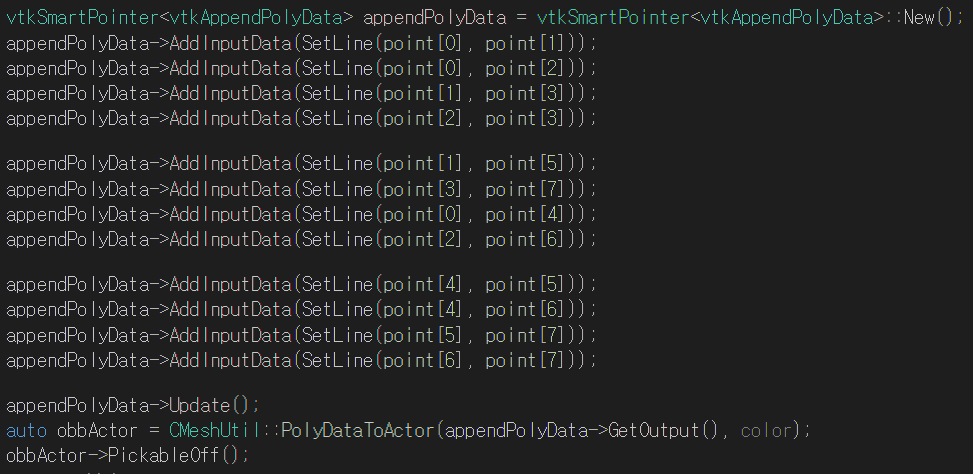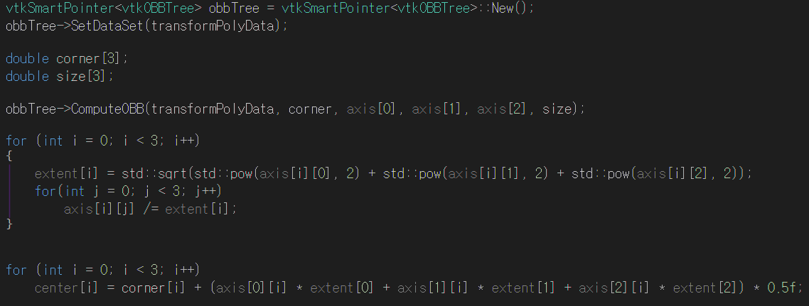 위의 정보들은 vtkOBBTree Filter를 사용하여 아래와 같이 받아올 수 있습니다.