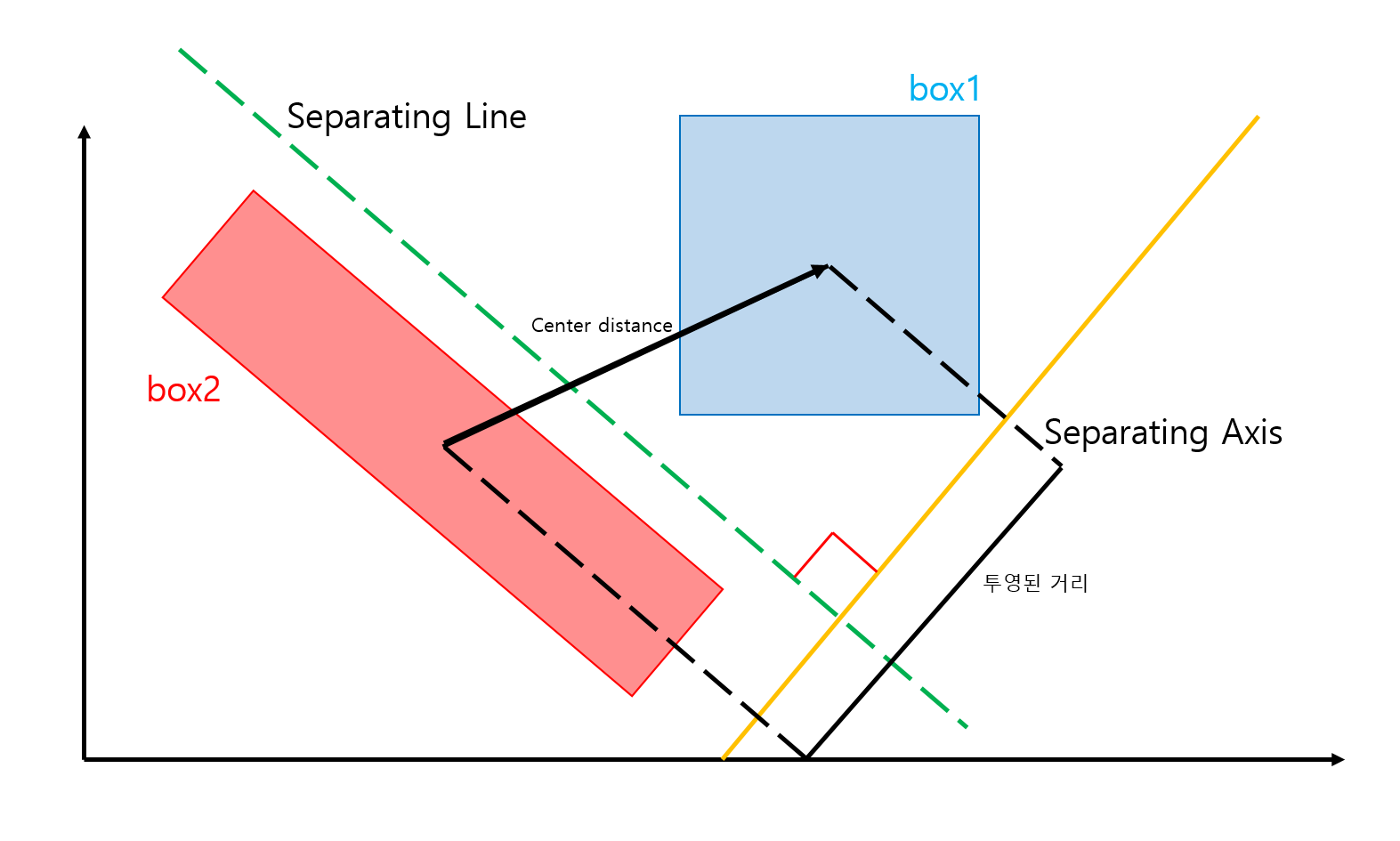 각 거리를 더해 비교해보면 Axis 벡터 * Extent가 투영된 거리의 합보다 두 box의 Center를 이은 벡터가 투영된 거리가 더 긴 것을 확인할 수 있습니다. 따라서 두 Box는 충돌하지 않았다 라고 판단 할 수 있게 됩니다.