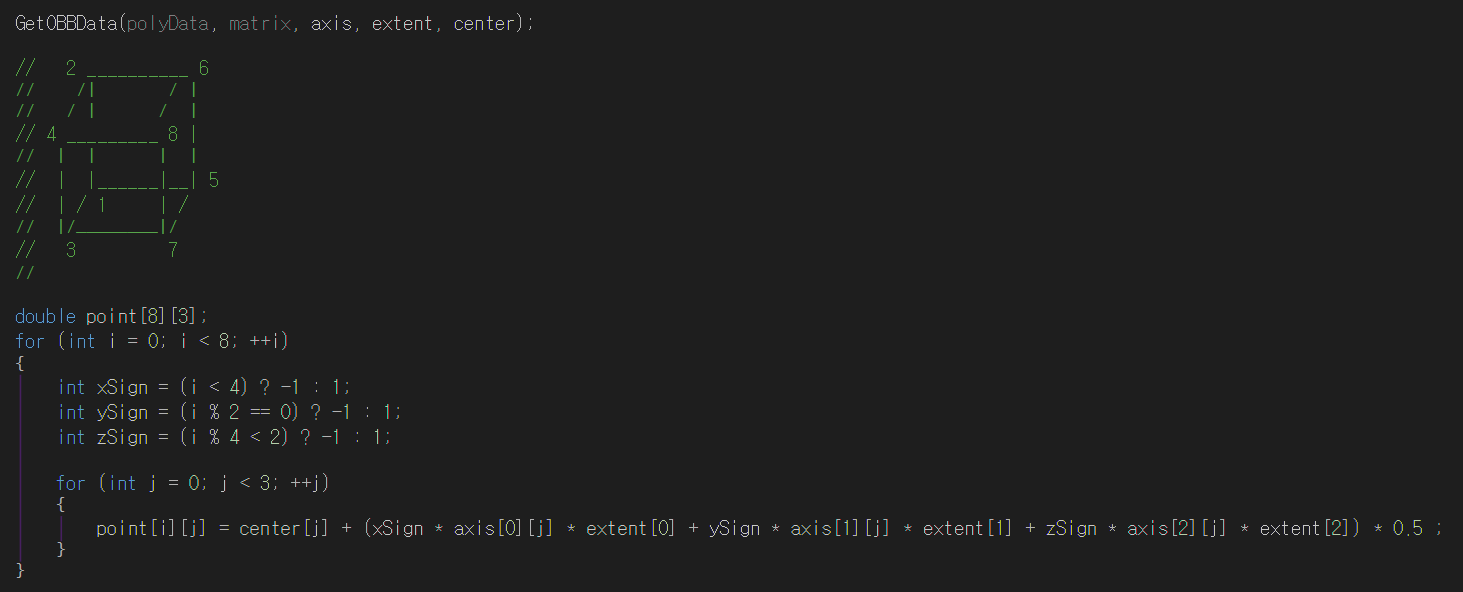 다음으로는 Bounding Box를 Rendering 해주기 위해서 각 꼭지점의 좌표를 계산하고 각 꼭지점을 Line으로 이어주는 작업이 필요합니다. 아래 코드에 주석으로 그려놓은 그림과 같이 꼭지점 번호를 임의로 지정하였고 각 꼭지점에 맞게 좌표를 설정해 주었습니다.