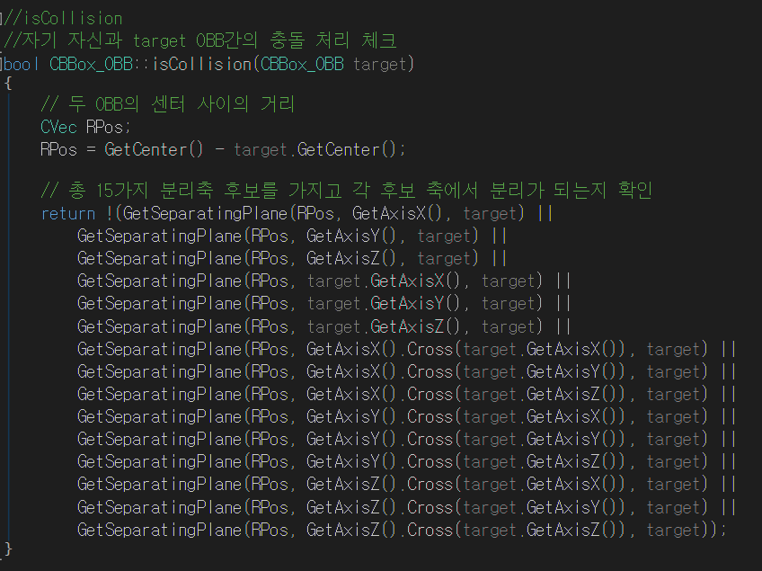 위의 과정을 총 15개의 Separating Axis에 대해 진행하고 단 하나라도 충돌이 됐다고 판단된다면 충돌처리하였습니다. 코드는 아래 그림과 같습니다. 모든 코드는 Git에 올려놓았으니 확인 및 Test가 가능합니다.