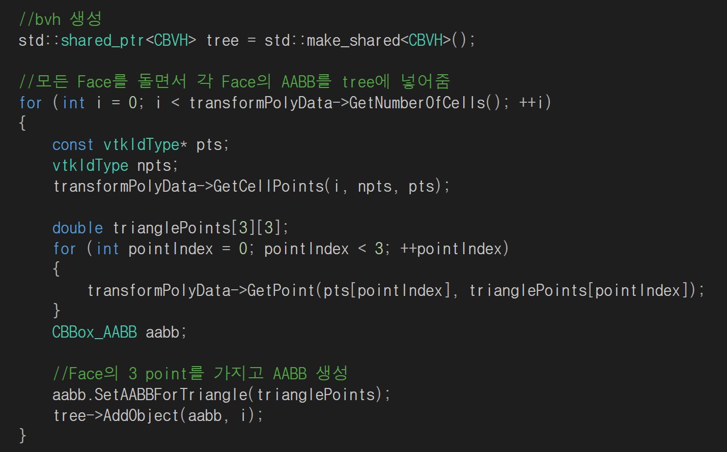 Code로 보면 아래와 같습니다. Mesh(transformPolyData)의 모든 face를 순회하면서 각 face의 3점을 가지고 AABB를 생성하고 tree에 넣어줍니다.