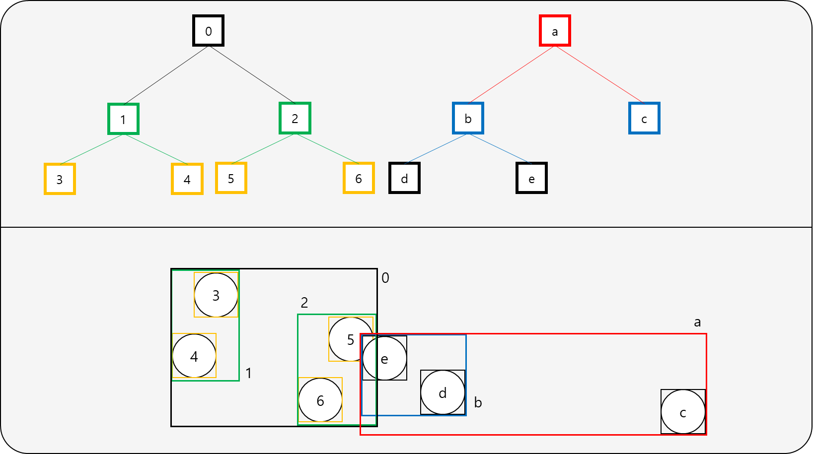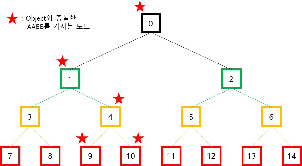 위의 예시를 보시면 검정색 0번 노드는 단말노드 7~14의 AABB를 모두 포함하는 검정색 AABB를 가지고 있고,