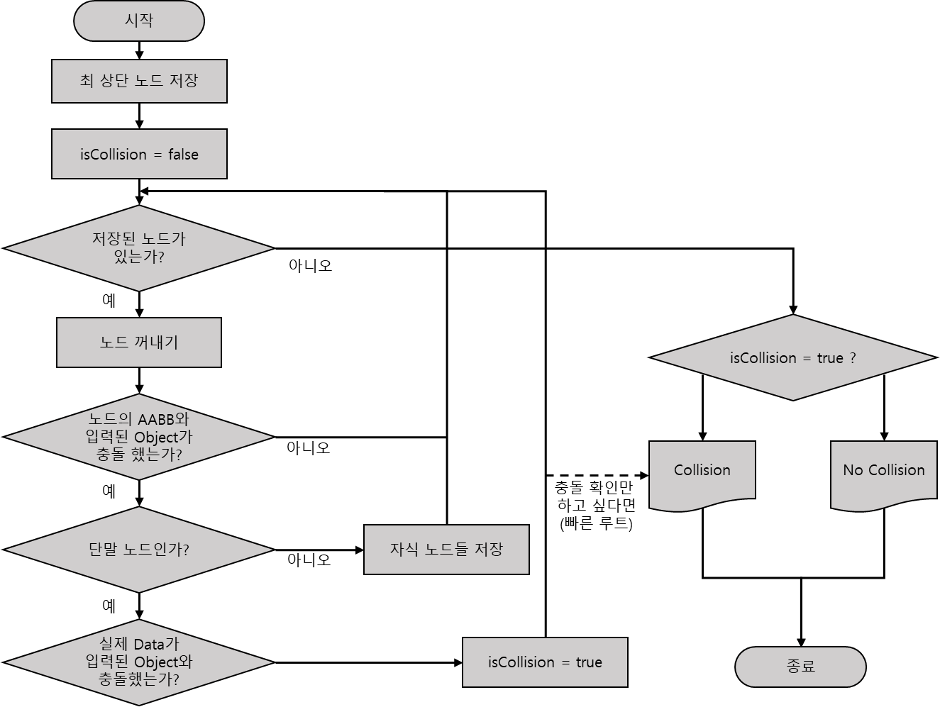 BVH를 활용하여 충돌 검사를 하는 순서는 아래와 같습니다. 이번 포스팅을 쭉 읽은 뒤에 다시 순서도를 보시면 좀 더 이해하기 수월하실 것 같습니다.
