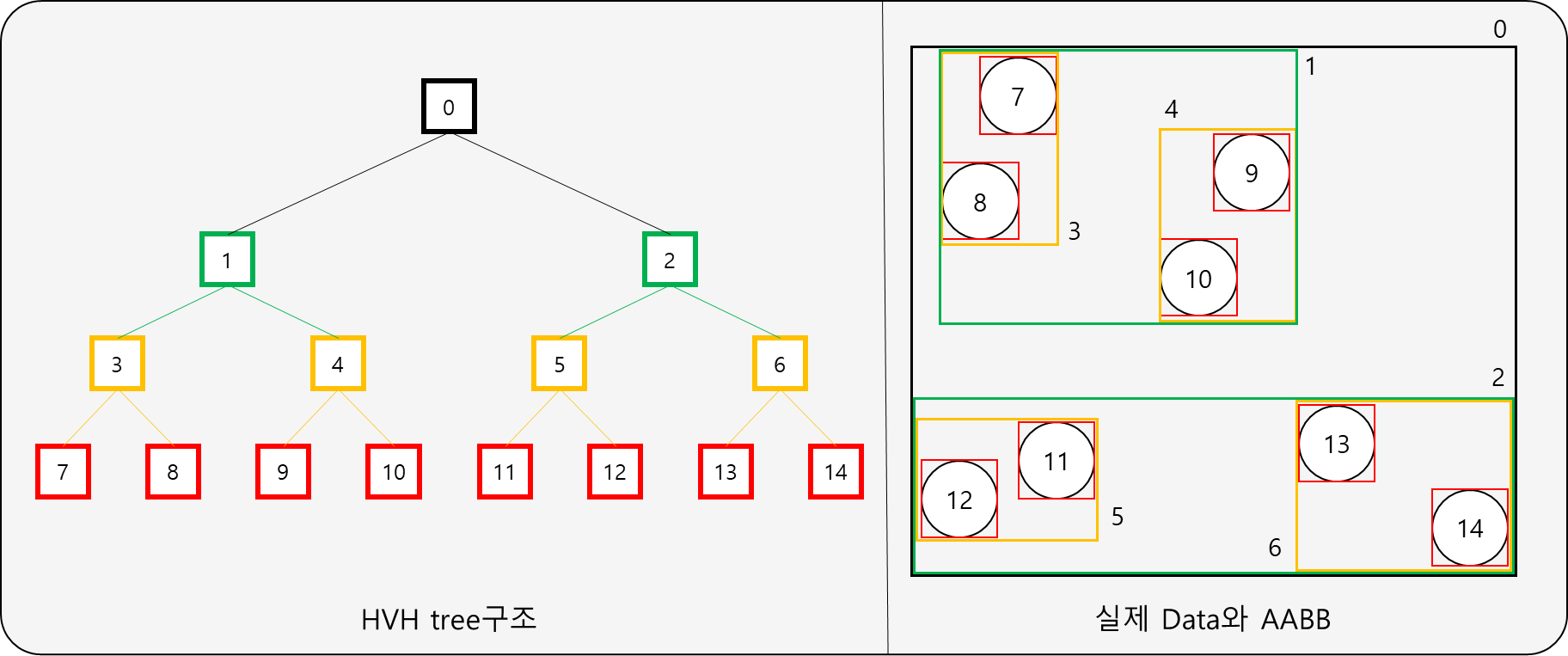 오른쪽 실제 Data의 원들(7~14)이 BVH를 구성하는 단말노드의 Data이고 전체 BVH는 왼쪽과 같이 구성하였습니다.