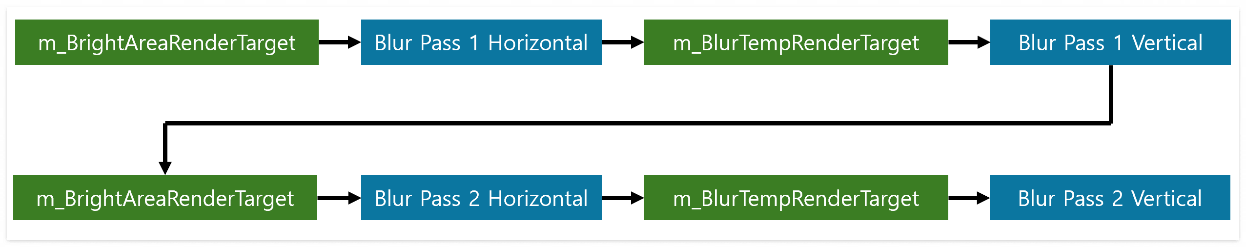 위 코드에서는 m_BrightAreaRenderTarget, m_BlurTempRenderTarget이 한 번의 Pass에서 각자 반대의 역할을 하게 되므로 나머지 연산을 통해 알맞게 셋팅될 수 있도록 했습니다.