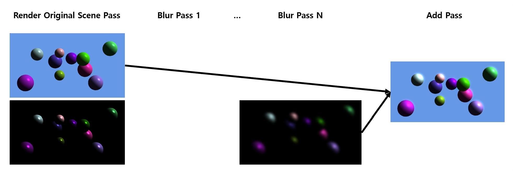 Bloom 효과를 구현하는 과정을 이미지로 요약하면 아래와 같습니다.