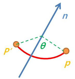 그렇다면 켤레 쿼터니안인 q*를 앞에다 곱하는 것은 어떤 의미일까요? 켤레 쿼터니안 q* = cosθ/2 + sin θ/2n ̂ 은 q* = cos(-θ/2) - sin(-θ/2)n ̂ 로 볼 수 있습니다. 즉 -θ/2 만큼 회전 시키는 쿼터니안으로 생각할 수 있습니다. 그런데 앞에다 곱하게 될 경우 벡터의 외적 연산 시 방향이 반대가 됩니다. 그러므로 앞에 곱한다는 것은 반대방향 회전 연산자를 뜻하게 됩니다. 반대방향으로 -θ/2 회전한 다는 것은 원래 방향으로 θ/2회전한다는 의미하므로, p'=q^ porthoq 을 한다는 것은 p의 벡터성분을 n ̂을 축으로 온전히θ만큼 회전시키는 것을 의미게 됩니다. 이 것이 가장 핵심적인 개념입니다.