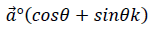 a벡터의 방향을 i방향으로 잡고 회전 축의 방향을 k방향으로 잡은 후 회전하는 이미지를 나타낸 것입니다. i방향으로는 cos값 만큼 줄고 j방향으로 sin값이 곱해진만큼 더해지는 것을 통해 회전이 표현됨을 볼 수 있습니다. 위 연산은 일반적인 벡터 곱 연산을 사용하여 표현 가능할 것으로 보입니다. 우선 기존 벡터 a에 cos값을 곱하는 부분도 있으므로 스칼라와 벡터 곱을 동시에 쓰면 정확히 표현될 것입니다.