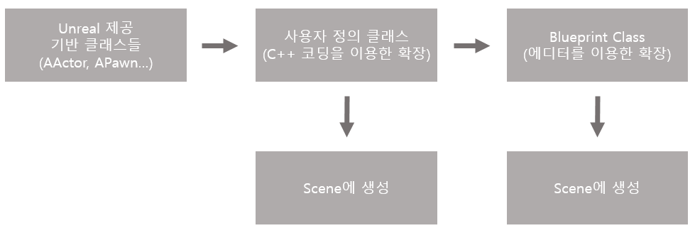 또한 C++을 이용해 확장하는 과정을 생략하고 Unreal 제공 기반 클래스를 바로 Blueprint로 확장하는 것도 가능합니다.