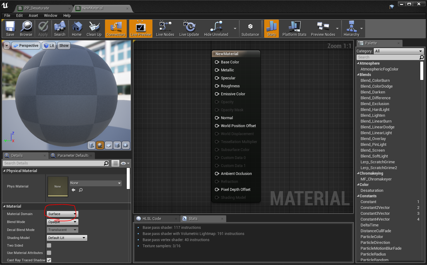 Material을 만들고 가장 먼저 해야할 일은 Material Domain을 바꾸는 것입니다.