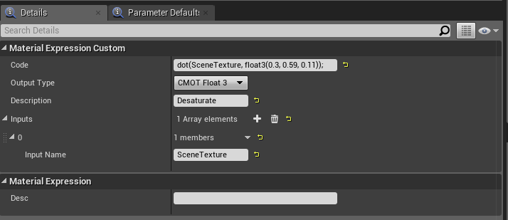 Code 부분만 주의 깊게 보면 되는데 내용은 SceneTexture의 각 Color 값과 (0.3, 0.59, 0.11) 벡터와 내적하는 것입니다.
