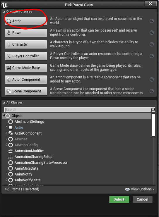 레벨에 배치할 것이므로 Actor Class를 부모 클래스로 만듭니다.