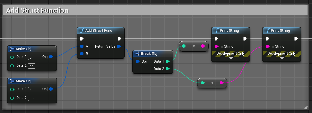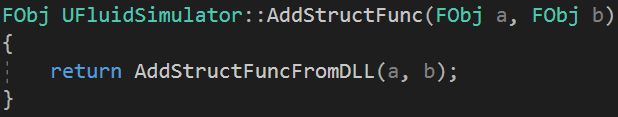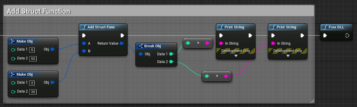 위 블루프린트에 보이는 Add Func 노드와 Add Struct Func 노드는 DLL에서 불러온 함수를 호출하는 코드가 정의되어 있습니다. 함수의 결과로 리턴하는 값도 DLL에서 불러온 함수가 리턴한 값입니다.