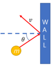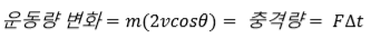 공기가 한 벽면을 누르는 힘을 계산하기 위해선, 한 공기입자가 벽에 충돌할 때 전달되는 힘의 크기를 계산한 후에, 충돌하는 공기 입자의 개수를 곱해주어야 할 것입니다. 물론 문제는 입자마다 전달하는 힘의 크기가 다를 것이므로 단순한 곱하기가 아닌 적분연산이 필요할 것입니다. 그렇다면 우선 한 입자가 벽에 충돌할 때 전달되는 힘의 크기를 계산해보겠습니다. 우선 이 입자는 질량이 m이며 벽의 수선과 θ의 각을 이루는 방향으로 운동한다고 가정하겠습니다. 이 입자가 충돌할 때 전달되는 힘을 계산하는 것은 어려우나, 이 입자가 완전 탄성 충돌을 한다고 가정하였을 때 입자의 운동량 변화는 비교적 계산하기 쉽습니다. 속도의 변화량에 질량을 곱한 값이므로 입자의 운동량 변화는 아래와 같습니다.