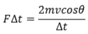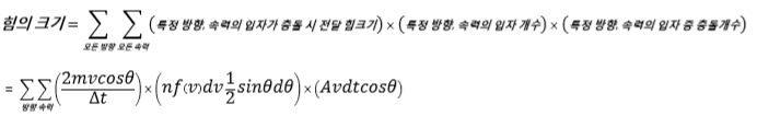 운동량변화는 입자에 전달된 충격량과 같으며(뉴턴의 2법칙), 입자에 전달된 충격량의 크기와 벽에 전달된 충격량의 크기는 같으므로 위의 식이 성립합니다. 델타 t의 경우는 입자와 벽의 재질과 같이 여러 값에 의해 변하므로 결정하기가 까다롭습니다. 즉 지금까지 정보를 통해 질량이 m이며 운동방향이 벽의 수선과 θ의 각을 이루는 입자가 충돌 시 전달되는 힘의 크기는 아래 식과 같습니다.