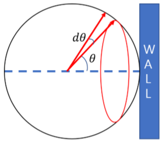 단위 부피 속의 입자 개수를 n개로 가정하고 출발하겠습니다. 그럼 우선, 딱 특정 θ의 각을 이루는 입자의 개수는 통계적으로 0개 일 것입니다. 왜냐하면, 연속적인 가능한 모든 방향 중에서 한방향을 갖을 확률은 0이기 때문입니다. 그러므로 θ에서부터 θ+dθ 사이의 입자 개수를 고려해야합니다. 특정한 벽과 θ를 이루는 공기 입자들은 삼차원 공간에서 옆의 그림과 같이 분포합니다. 그러므로 θ에서부터 θ+dθ 사이 각을 이루는 입자들은 빨간 색 원을 따라 폭이 dθ인 띠 형태로 분포합니다. 전체 구의 표면적은 4파이 이므로, 전체 입자 중에 θ에서부터 θ+dθ 사이 입자의 비율은 4파이 분에 띠의 면적이 됩니다. 원의 둘레는 2x파이xsinθ이고 폭이 이므로 띠의 면적은 대략 2x파이xθxdθ입니다. 즉 단위 부피 속 벽과 각도가 θ에서부터 θ+dθ사이를 이루는 입자의 개수는 아래와 같습니다.