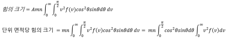 위 식과 하나 더 위의 식을 근거로 벽의 수선과 각도가 θ에서부터 θ+dθ 사이이며 속력이 v에서 v+dv 사이의 입자의 개수는 아래 식과 같습니다.