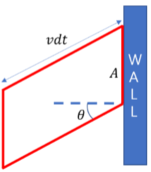 마지막으로, 벽의 면적을 A 라고 할 때 dt 동안 벽과 충돌할 입자의 수는 몇 개일 까요? 입자들이 모두 같은 속력과 방향을 갖고 있을 경우에 말입니다. 아래 그림을 보면 쉽게 답을 얻을 수 있습니다. 빨간색 평형사변형 모양의 부피 속에 존재하는 모든 입자들은 dt 시간안에 A 부분과 충돌하게 됩니다. 이 안의 입자들은 dt 시간내에 벽면에 도달하기 때문이죠. 즉 이 부피 속의 입자의 개수가 dt 시간안에 A에 충돌하는 입자의 개수입니다. 단위 부피당 입자의 개수가 n이므로 dt 시간 동안 충돌하는 입자의 개수는 아래와 같습니다.