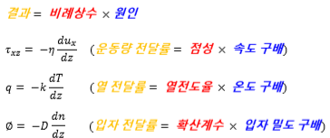 두번째 열에 관한 수식을 해석하자면, ‘위치에 따른 온도차이(온도구배)가 원인이 되어 열전달이 일어나고, 열전달율은 온도구배에 비례하며, 그 비례상수가 열전도율 k이다.’입니다. 세번째 입자확산에 대한 수식을 해석하자면, ‘입자의 밀도차이가 원인이 되어 확산현상이 일어나며, 입자의 전달율은 입자의 밀도차에 비례하며, 비례상수는 확산계수 D이다.’입니다. 유체에서 운동량 전달, 열전달, 입자 확산 모두 유사한 형태의 수식을 갖고 있습니다. 이는 세 현상 모두 입자의 확산을 통해 이동하기 때문에 같은 형태의 미분방정식을 통해 표현되는 것일 것입니다. 운동량 전달은 속도가 빠른 입자가 주변으로 이동하며 주변을 빠르게 만들고, 열전달도 온도가 높은(결국 이것도 빠른 것이 겠군요.) 입자가 주변으로 이동하며 발생하는 것이고, 입자전달은 입자 이동 그 자체를 다루는 현상이죠. 결국 세 현상 모두 입자의 이동으로 설명되는 현상들이며, 이 현상들에 원인과 결과 사이를 이어주는 비례상수들이 이번 자료에서 다루는 점성, 열전도율, 확산 계수가 되는 것이지요. 그럼 다음 섹션에선, 이번 섹션 가장 위에서 적은 점성, 열전도율 확산 계수 세 수치의 정량적인 수식을 유도해 보겠습니다. 감사합니다.