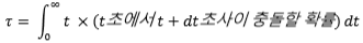 dt는 미소 값이므로 ‘t초에서 t+dt초 사이 충돌 확률’은 t초에서 충돌할 확률과 같습니다. t초에서 충돌할 확률 시간 t를 곱했으므로, 0초부터 무한대까지 적분한다면 충돌 기대시간을 구할 수 있습니다.