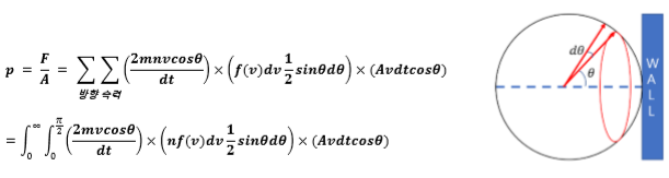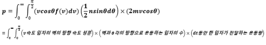 적분 기호 속 첫번째 항의 의미는 입자 하나가 충돌할 때 전달하는 운동량이고, 두번째 항은 벽의 법선 방향과 세타 각의 방향으로 운동하는 입자의 개수 곱하기 속도이고, 마지막 항은 벽에 부딪힐 입자들이 차지하는 부피입니다. 쉬운 이해를 위해서 식을 재정리하겠습니다.