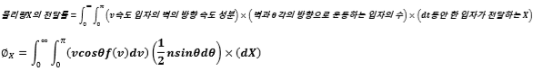 말씀드린 대로 압력식의 운동량이란 수치를 임의의 물리량 X로 변경하였습니다. 그리고 한가지 더 변경점이 있는데요, 바로 각도의 적분 범위를 90도가 아닌 180도까 확장하였습니다. 위의 벽과 구형의 있는 그림을 다시 보시면 이 각도의 확장의 의미를 이해하기 쉽습니다. 0도부터 90도라는 것은 벽방향으로 반구 방향으로 운동하는 입자만 고려하겠다는 의미입니다. 압력은 벽을 때릴 때 전달되는 운동량을 고려해야하기 때문에 반구만 고려해도 되지만, 다른 이동현상들은 사방팔방 이동하며 전달되는 물리량을 고려해야합니다. 그렇기 때문에 적분구간이 180도가 되었습니다. 그렇다면 X에 이제 운동량, 열, 입자 그 자체를 대입하겠습니다.
