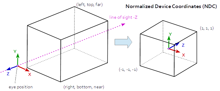 NDC는 그림 대로 (-1,-1,-1)에서 (1,1,1)의 큐브 형태로 만들어진 공간입니다.