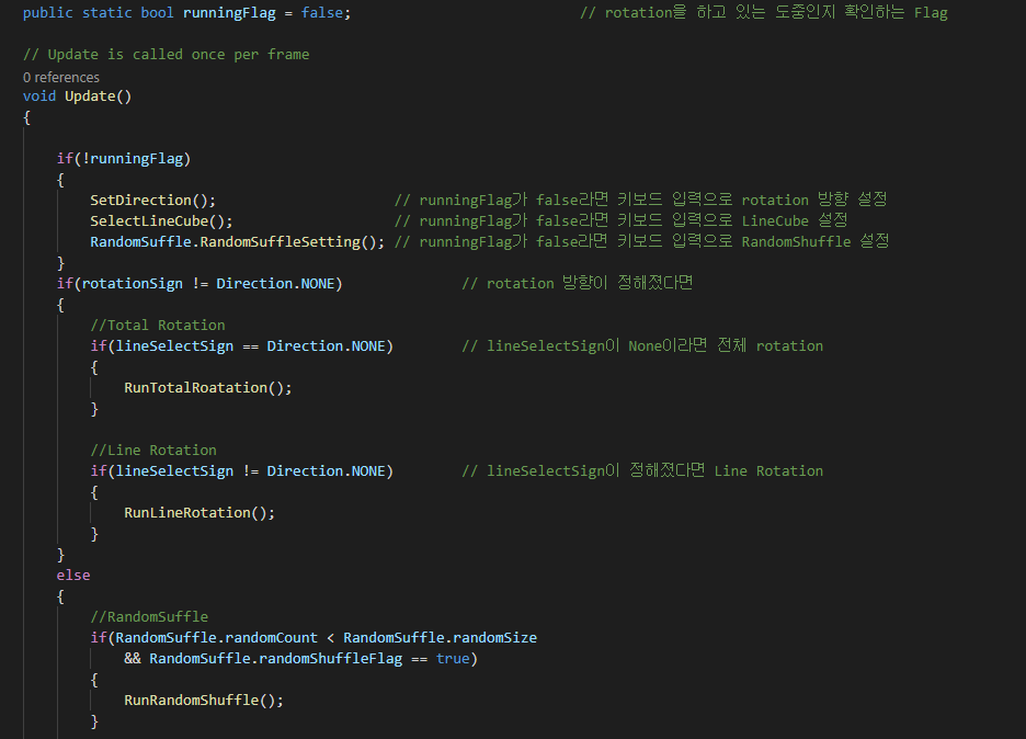 그 다음 실제로 Rotation을 시켜주는 RunRandomSuffle 함수를 만들어 봅시다. 간단히 설명하자면 randomSize만큼 Rotation을 실행하고 각 Rotation은 randomValue들에 의해서 결정됩니다. 자세한 설명은 주석을 보시면 쉽게 이해할 수 있습니다.