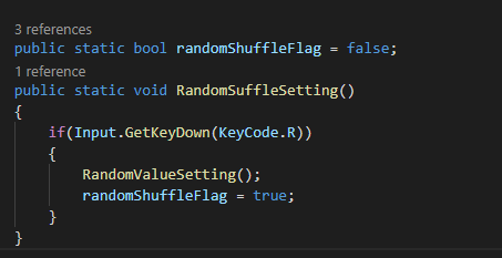 이제 키보드 R키를 누르면 RandomValue들이 Setting 되는 함수를 만들어봅시다. Code는 아래와 같습니다. Flag는 true일 때 RandomShuffle을 실행하고, false면 하지 말라는 Flag가 되겠습니다!