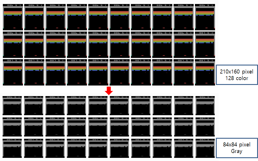 Pre-Processing을 거치지 않은 Data는 아래 그림과 같이 210*160 pixel과 128 color palette를 가지고 있었습니다. 따라서 많은 메모리와 계산이 필요했기 때문에 이 부분을 줄이고자 Pre-Processing을 진행하였습니다. 결과적으로 84*84 pixel 크기의 Gray Data로 변경하여 용량을 줄였습니다.