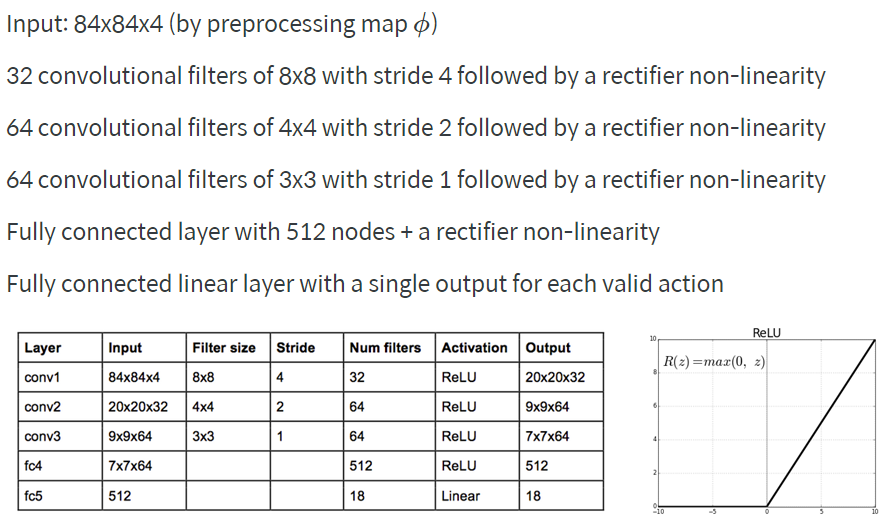 이렇게 만든 이미지가 하나의 State가 됩니다. 이렇게 만든 State를 M개씩 쌓아 하나의 State 뭉치를 만들면 그것이 입력으로 사용되는 State가 됩니다. M개씩 쌓는 이유는 현재의 움직임의 방향을 알기 위해서 쌓았습니다. 논문에서는 M을 4로 두었습니다. 따라서 한 State는 84x84x4 사이즈를 가지는 State가 됩니다.