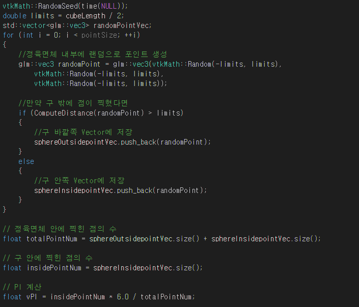 저는 VTK를 활용해서 구와 정육면체를 생성하고 정육면체 내부에 랜덤으로 Point를 생성하였습니다. 중요한 코드만 살펴보면 CallBack.cpp 안의 아래 코드입니다. 랜덤으로 Point를 생성하고 PI를 계산하는 부분입니다. 크게 어려운 부분은 없습니다.