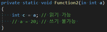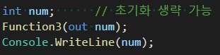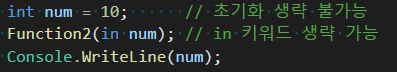 한 가지 기억할 것은 in, out 키워드는 내부적으로 ref 키워드를 붙였을 때의 동작 방식과 같으며