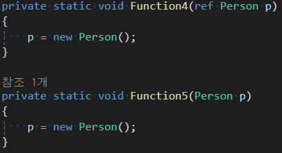 2번의 경우 위 예제에서 설명했듯이 Reference Type 변수의 생성을 함수 내부에서 하고 인자를 통해 전달할 경우 ref 키워드를 사용해야 합니다.