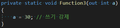 out으로 보내는 변수는 초기화를 생략할 수 있으며 함수 내부에서는 쓰기만 가능하며 강제됩니다.