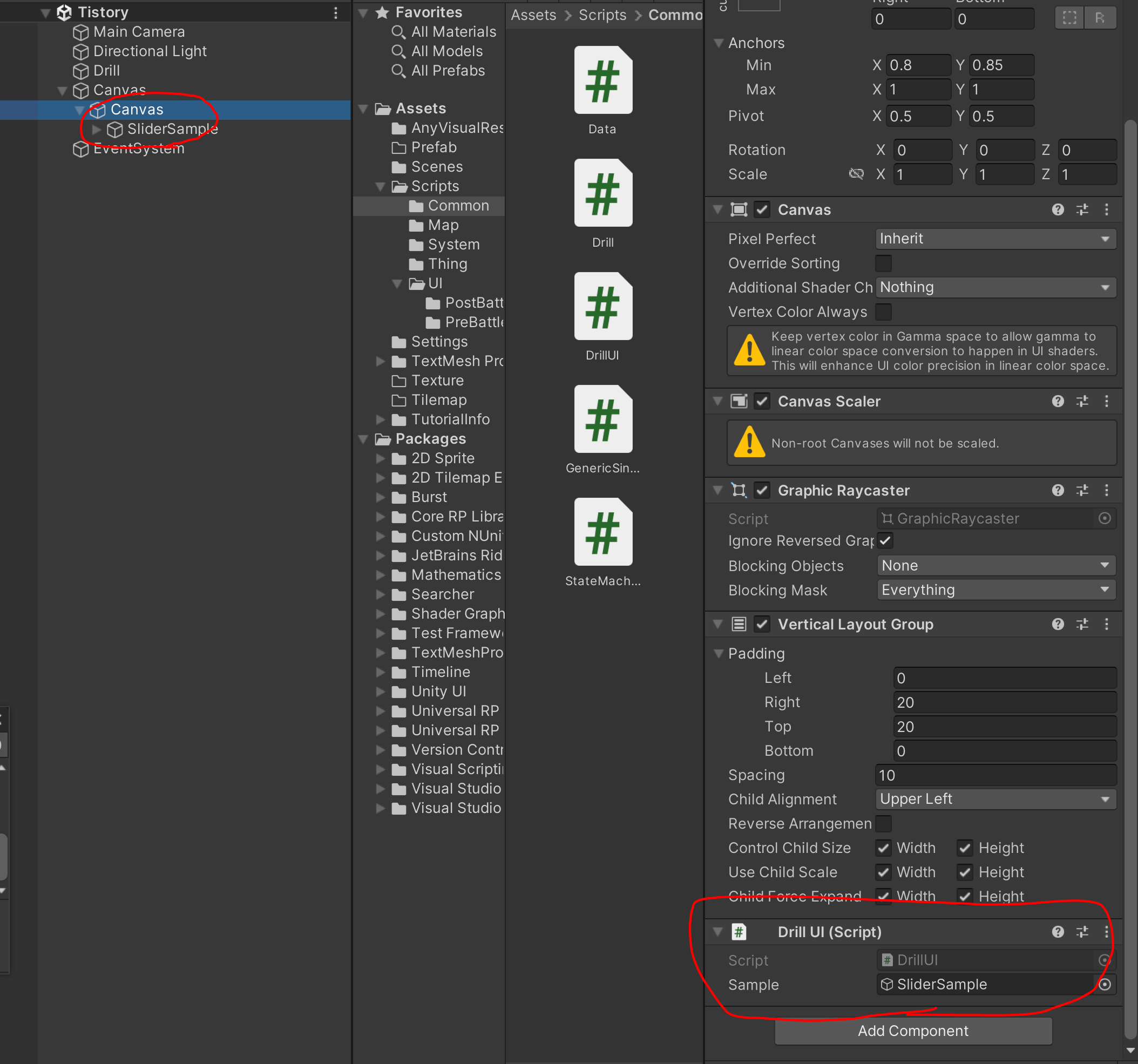 가장 먼저 한 일은 새로 Canvas와 Sample용 Slider를 하나 만들고 DrillUI라는 스크립트를 추가한 것입니다.