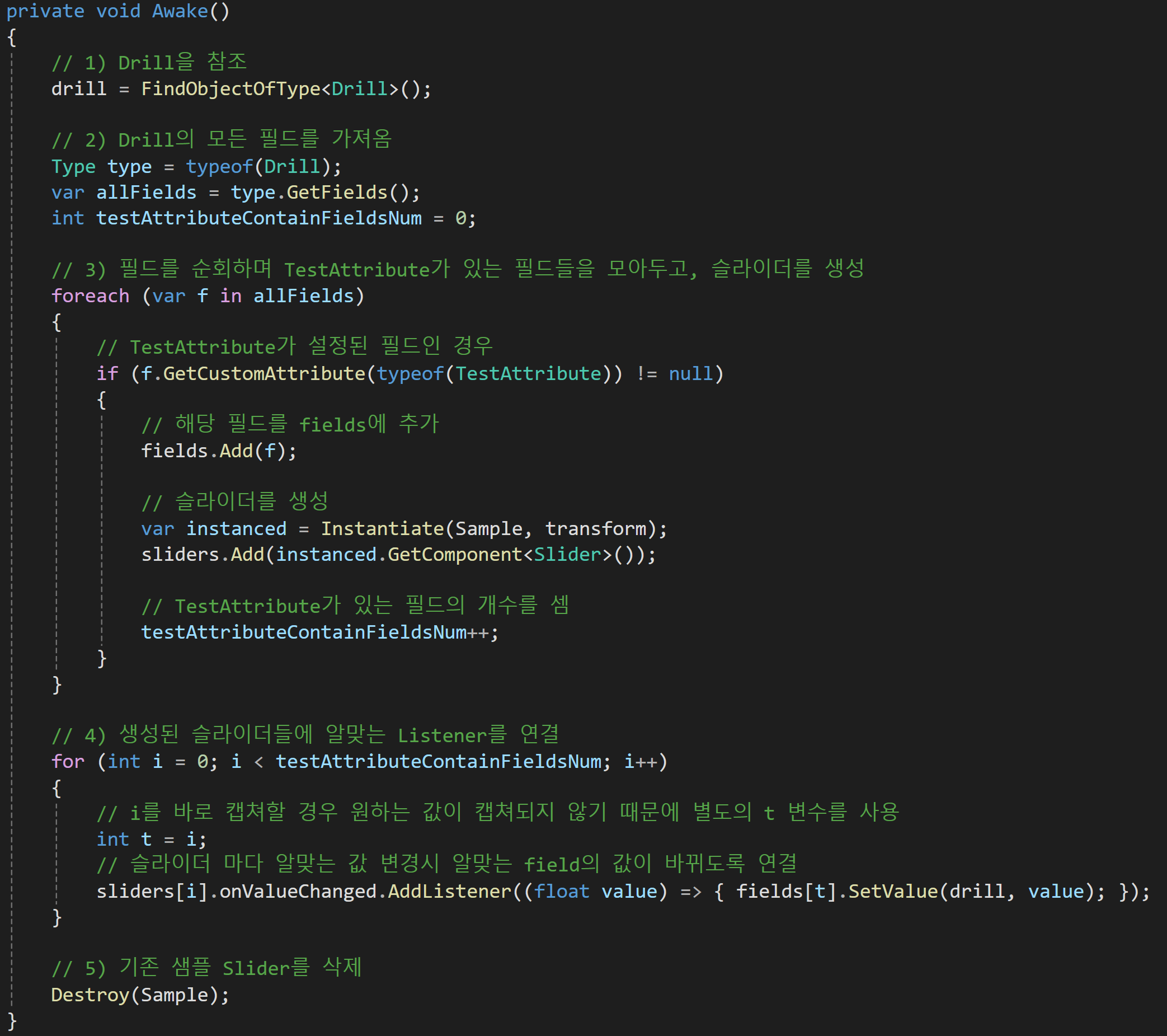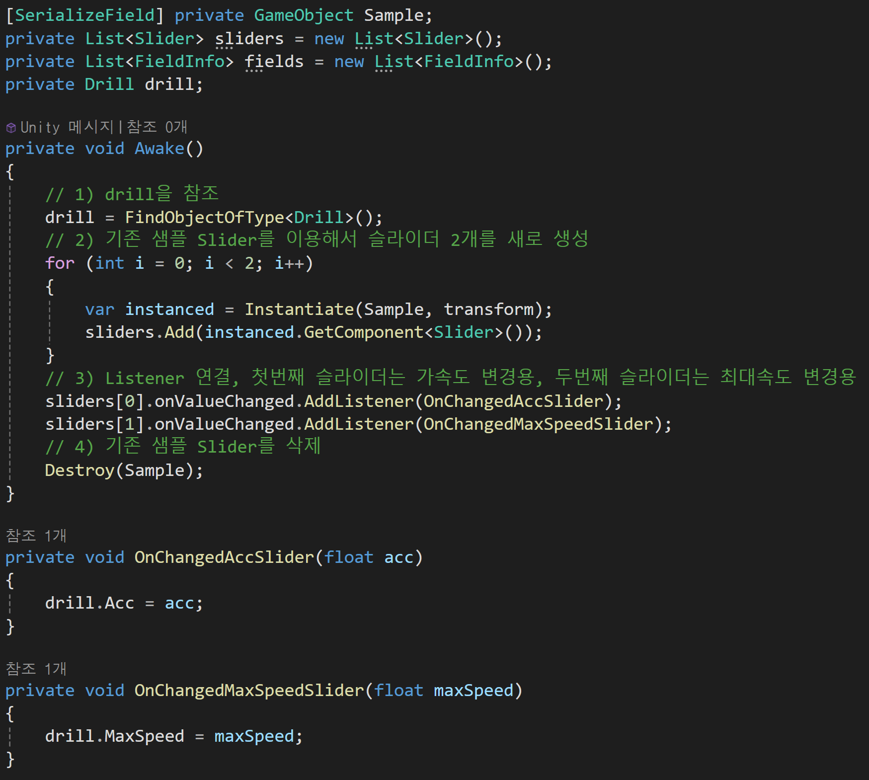 프로그래머는 단순히 어떤 값들이 슬라이더로 컨트롤할 Drill의 속성 값인지만 정해주면 됩니다.