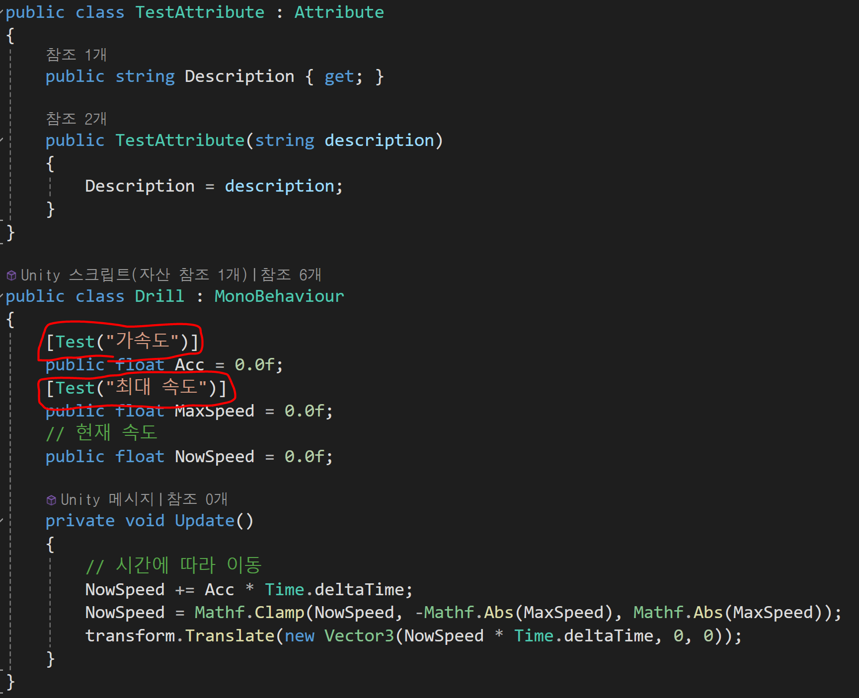 먼저 해야할 일은 TestAttribute라는 Attribute를 추가하고, 슬라이더로 컨트롤할 Drill의 속성들에게 Attribute를 달아주는 것입니다. 아래 이미지 처럼 가속도와 최대 속도 변수에 TestAttribute를 추가합니다.
