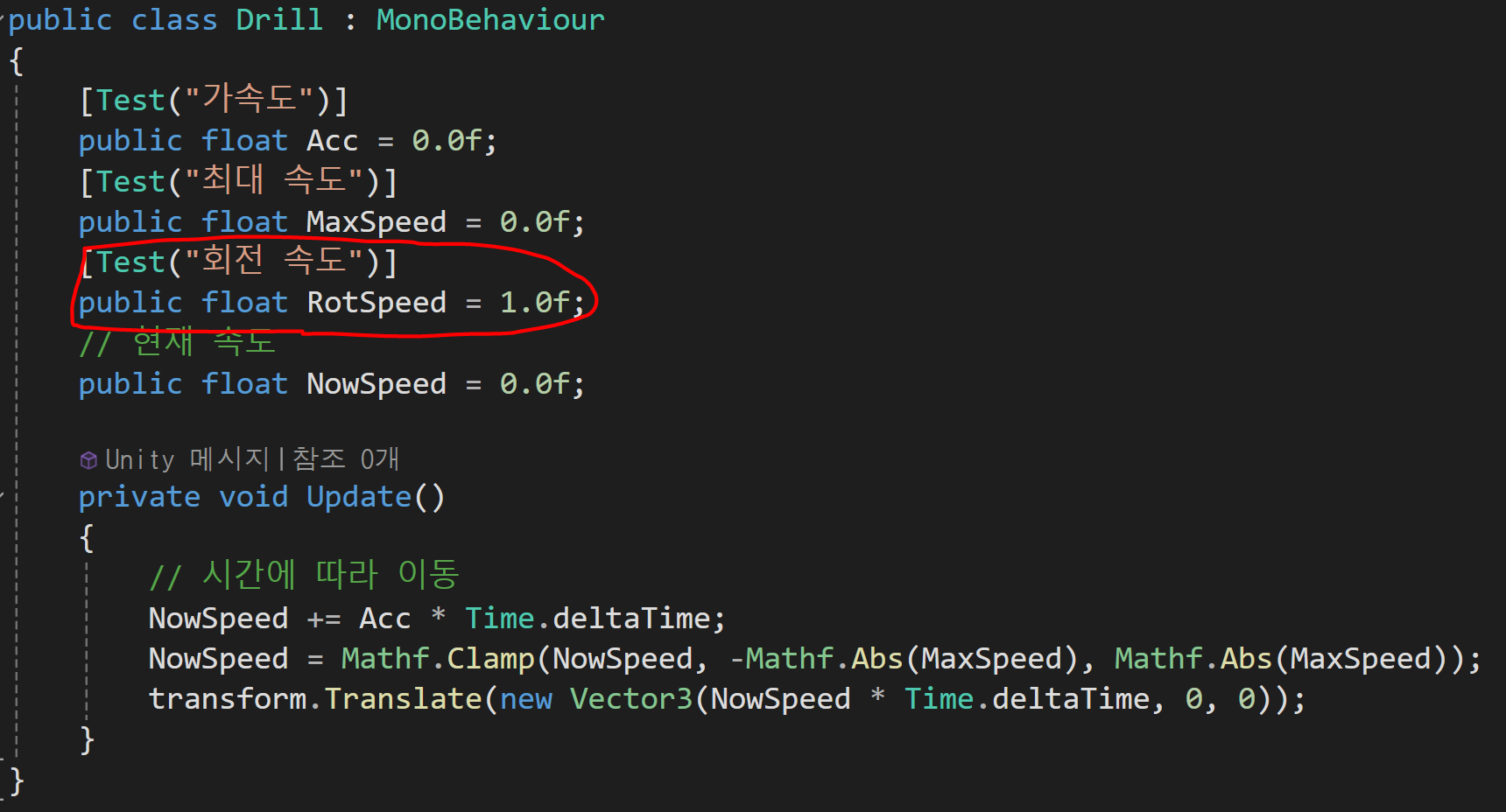 1) Drill에 RotSpeed라는 변수를 추가하고