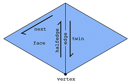 HalfEdge는 방향성을 가지는 Edge를 말합니다. 시작 Vertex와 도착 Vertex가 있으며, 한 Edge에 붙어있는 Face 개수만큼의 HalfEdge를 가지게 됩니다. 즉 Edge에 Face가 1개만 있는 Boundary 영역이라면 HalfEdge도 1개, Face가 2개 있는 경우에는 HalfEdge도 2개를 가지게 됩니다. 이러한 방향성 덕분에 여러가지 이점을 가지게 되는데 이 부분은 뒤에서 따로 다루도록 하겠습니다.