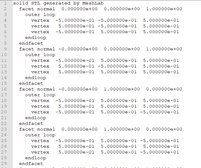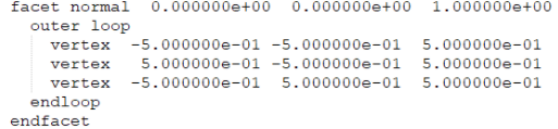 마지막으로 STL입니다. STL 파일의 특징은 삼각형만 표현한다는 것입니다. OFF에서는 여러가지 폴리곤을 다룰 수 있지만 STL에서는 오직 삼각형만 표현됩니다. 아래 그림은 STL 파일 형식으로 표현된 Cube의 일부입니다.