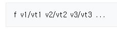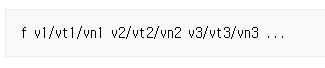 - Vi와 texture coordinate Vt, Vi와 Vt, Vn으로 표현되는 F(현재 내용에서는 다루지 않겠습니다.) "/" 한개로 표현